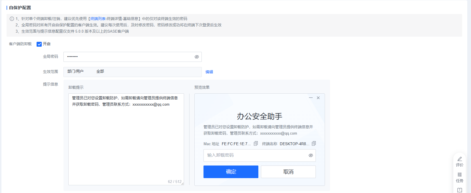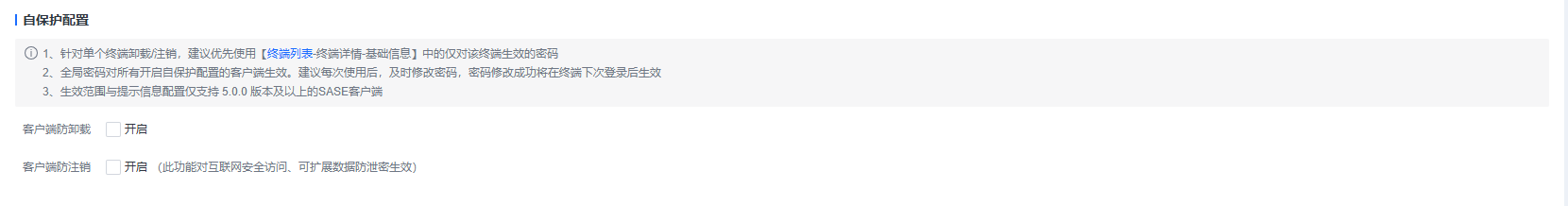 管理员可以通过自保护配置,设置客户端注销和卸载的密码,防止终端被恶意注销或卸载导致平台策略不生效。