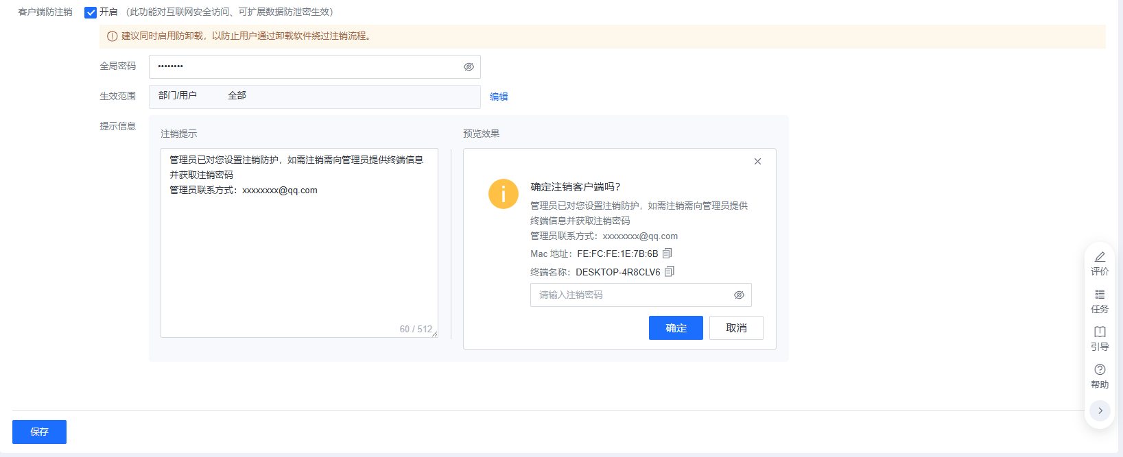 2、【客户端防卸载】可以通过控制台设置客户端防卸载密码,点击右边蓝色的<编辑>可以调整生效范围,可自定义提示信息。最后点击左下角<保存>生效。