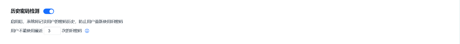 - 开启后可以检测历史密码情况禁止使用最近n次的旧密码,规范员工改密码安全风险。