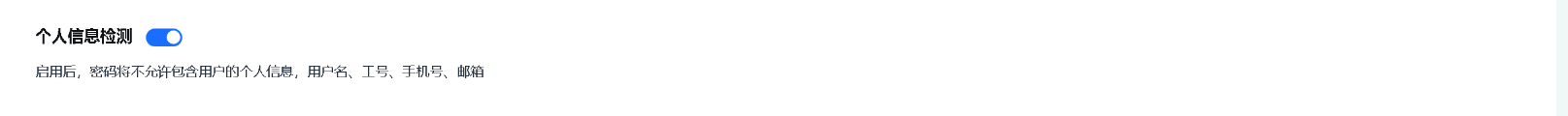 - 启用后,密码将不允许包含用户的个人信息,用户名、工号、手机号、邮箱