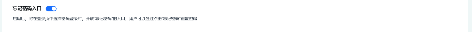 - 启用后,将在登录页中选择密码登录时,开放“忘记密码”的入口,用户可以通过点击“忘记密码”重置密码