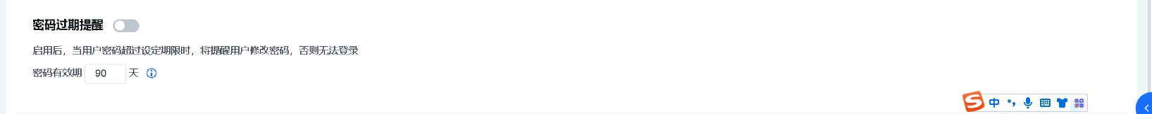启用后,当用户密码超过设定期限时,将提醒用户修改密码,否则无法登录(取值范围为1-180天)