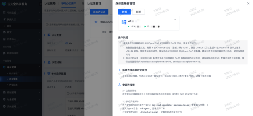 ①创建连接器:在SASE控制台的[身份管理/认证策略/认证源管理/身份连接器管理]点击<新增>创建身份连接器: