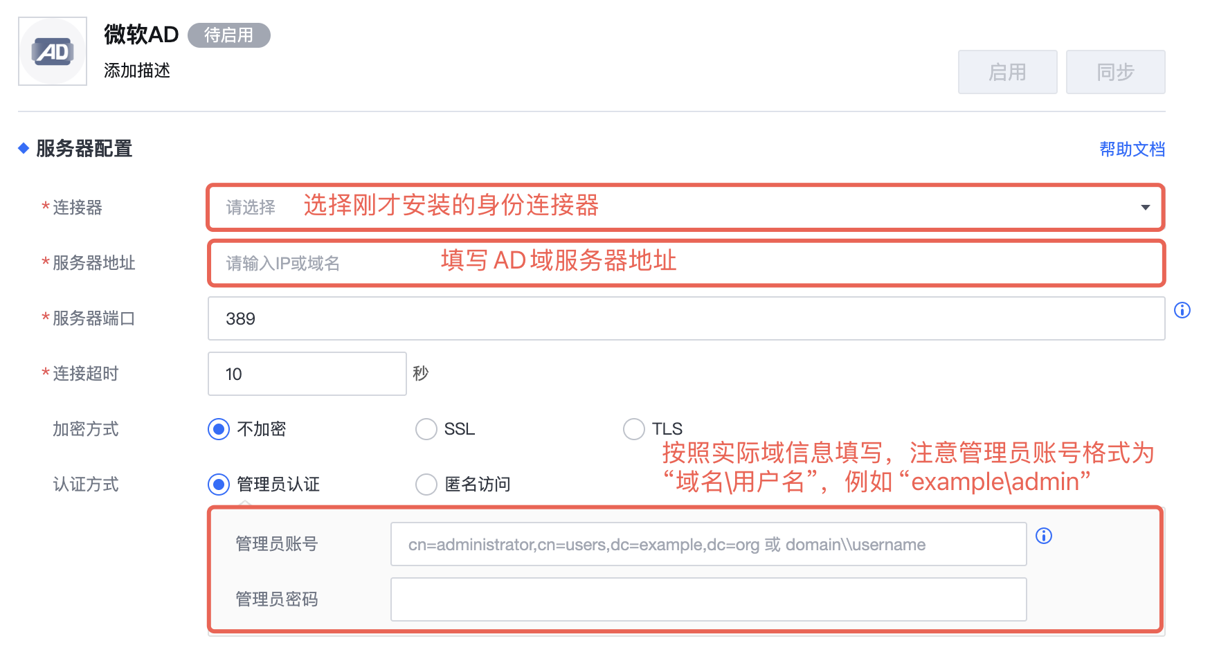 按照实际域信息填写,注意管理员账号格式为“域名\用户名”,例如“example\admin”