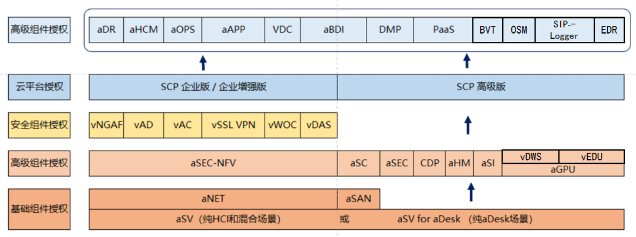 各类NFV组件(vAD、vAF、vAC等)及安全中心组件包括基线核查(BVT)、堡垒机(OSM)、日志审计(SIP-Logger)、终端检测响应平台(EDR)授权依赖于网络虚拟化(aNET),无法在HCI和SCP上单独授权使用。
