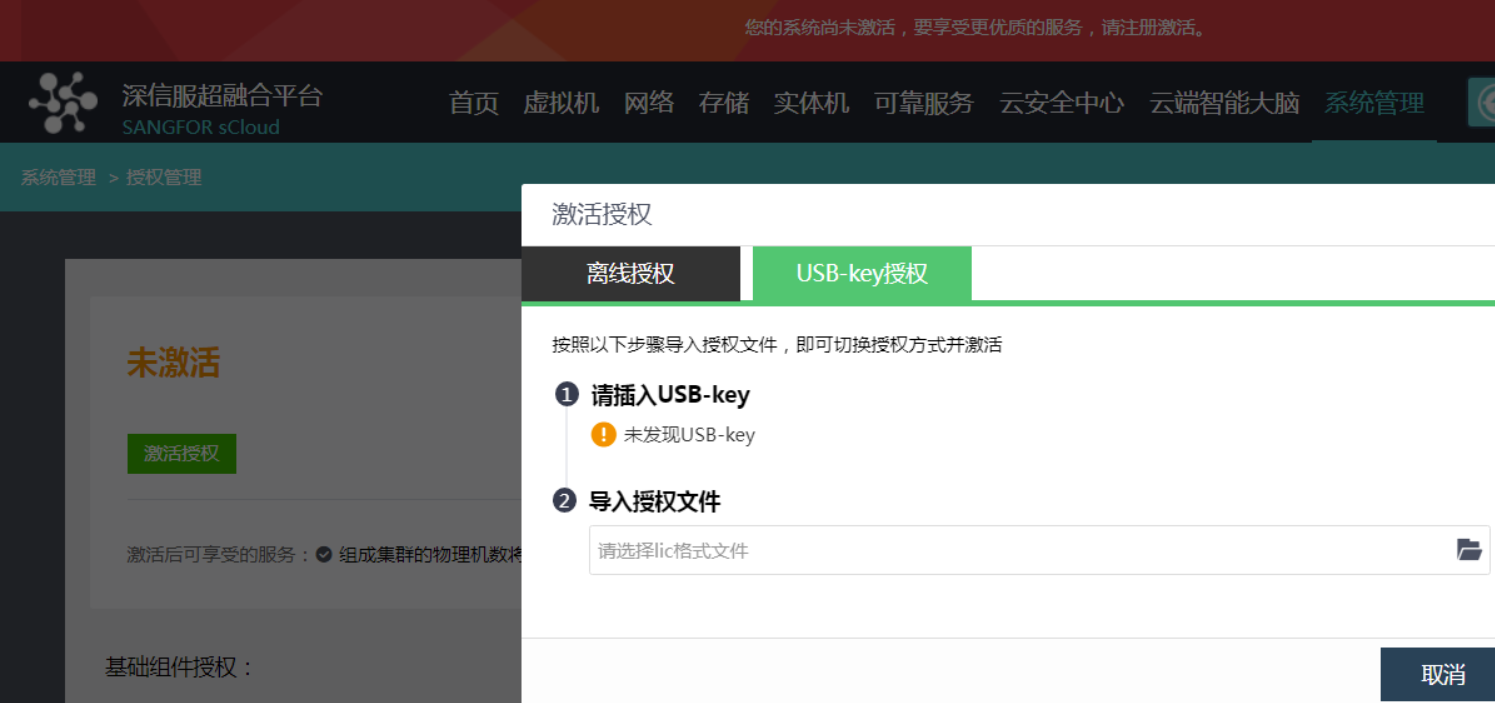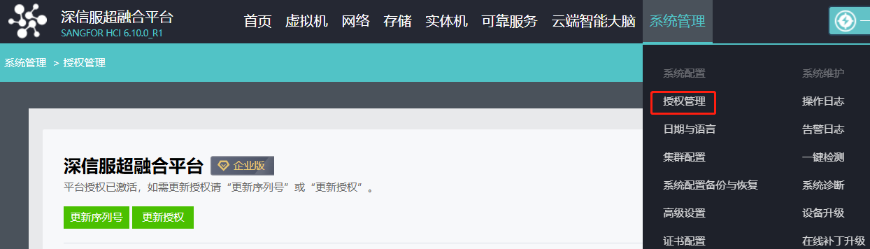 2.集群组建完成后,把授权key插入到HCI集群主机上,然后点击进入【授权管理】页面。