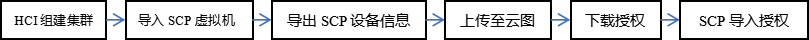 先组建HCI集群,并导入SCP虚拟机,登录SCP导出设备信息,并上传云图“深信服授权中心”获取授权文件,最后在scp授权页面激活授权。流程如下: