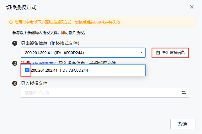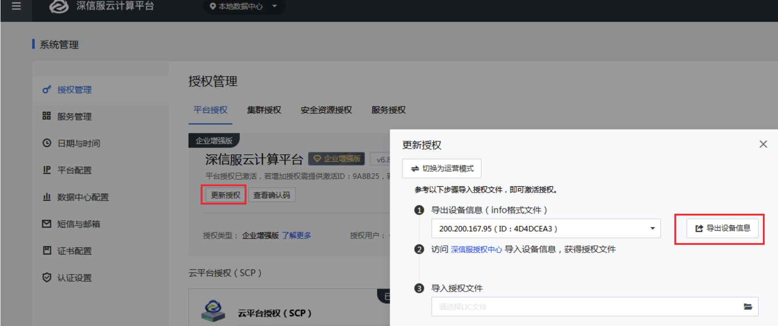 - 使用vkey授权场景下,当scp主备部署时,切换备scp为主,需重新使用备scp的设备信息申请vkey授权(scp集群部署不需要,集群部署需要选择2台SCP设备信息导出作为指纹去授权中心获取授权)