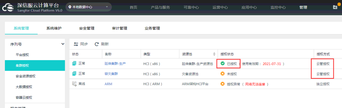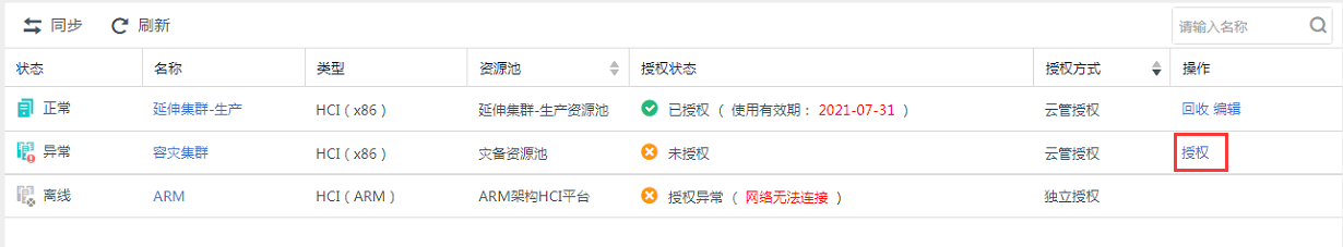 点击【授权】操作,可为新纳管的HCI进行授权。