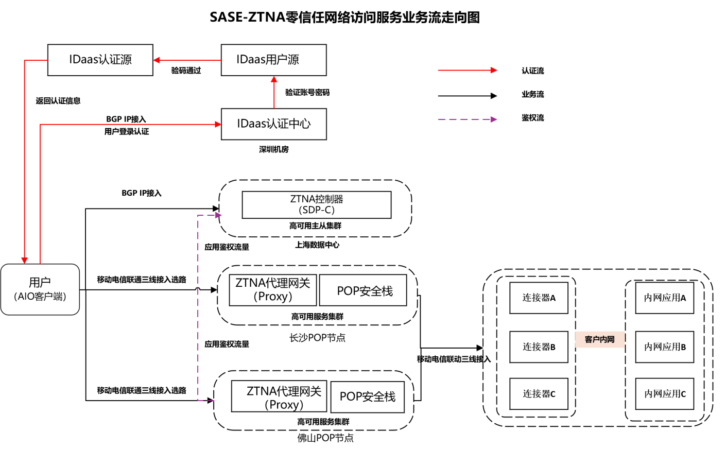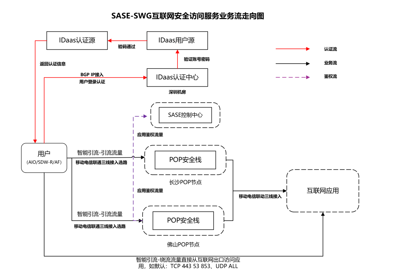 - 鉴权数据流(紫色):承载的是用户接入后互联网应用访问,鉴别用户互联网应用访问权限。