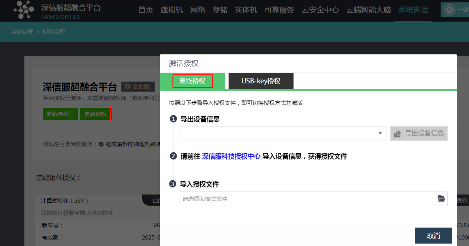 2、登录HCI web控制台【系统管理】-【授权管理】-【更新授权】-【离线授权】,导出设备信息