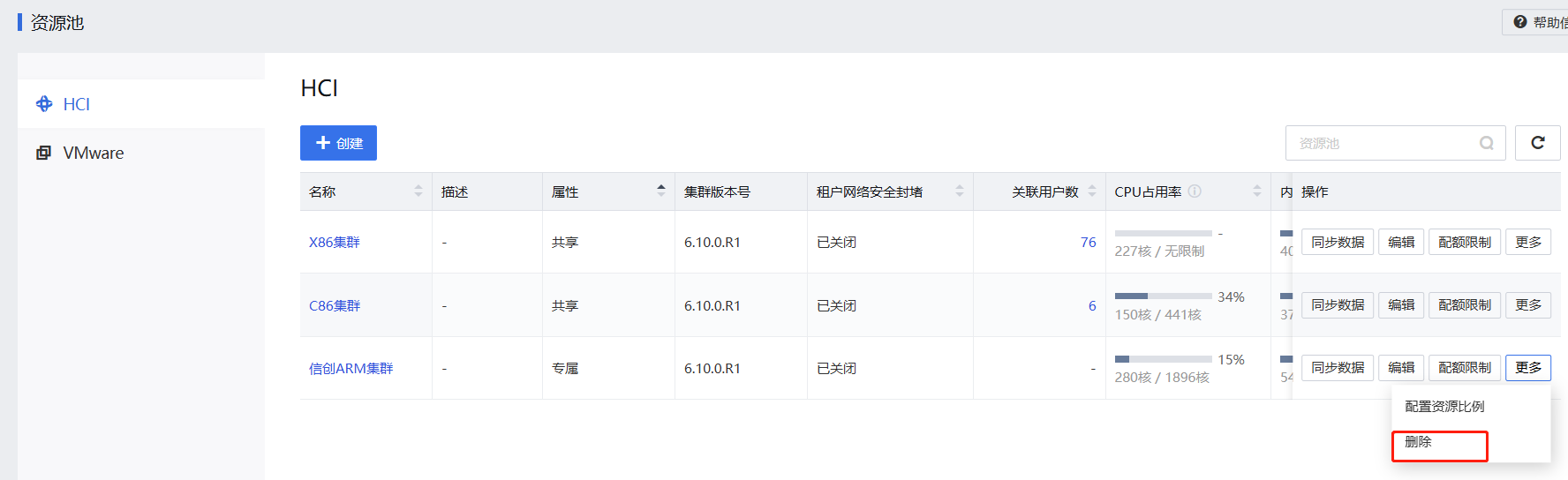 2、先将HCI脱离scp纳管。HCI脱离纳管需要先删除集群,删除集群需要先删除资源池,删除资源池需要删除相关的租户、回收租户云主机;回收租户、云主机后,才运行删除资源池,再删除集群。