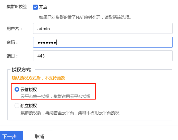 5、重新纳管HCI集群,在SCP添加集群的过程中,您会看到授权类型的选择界面,选择“云管授权”