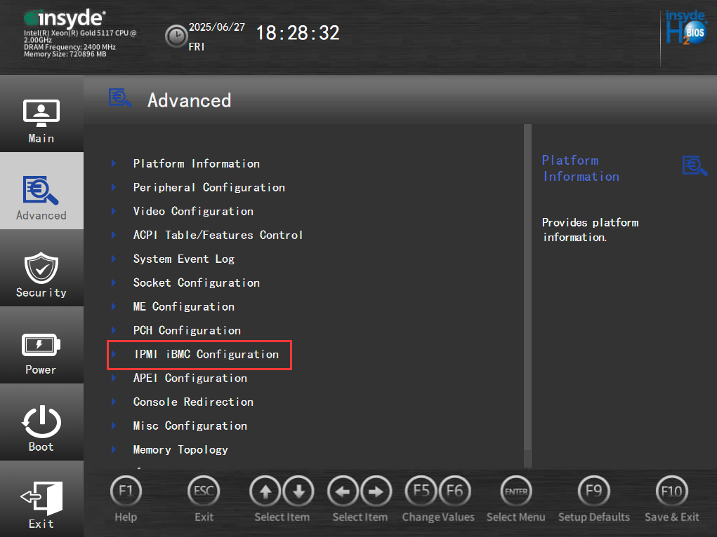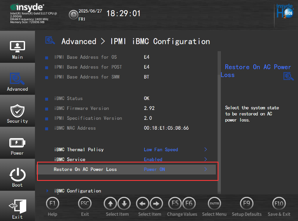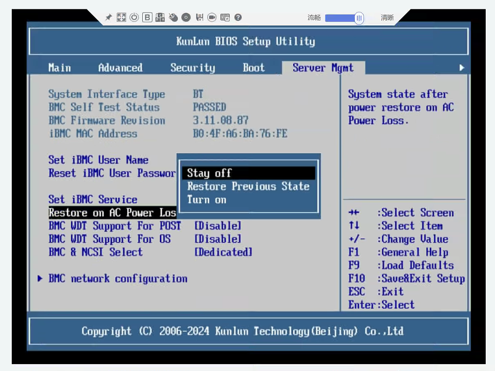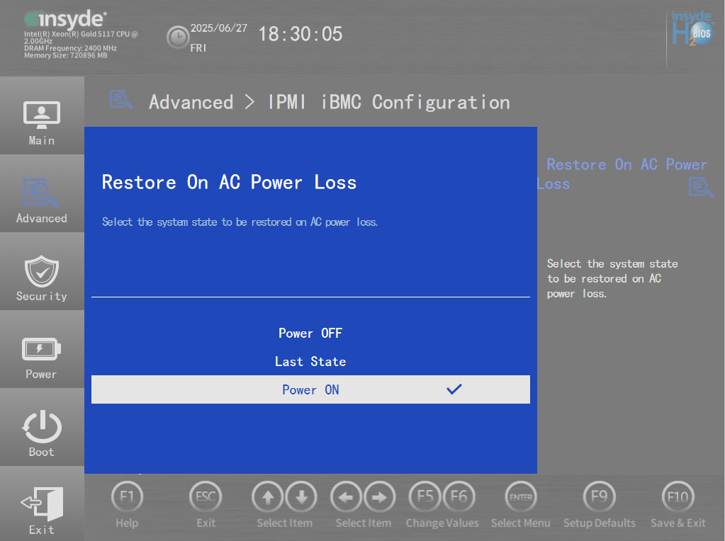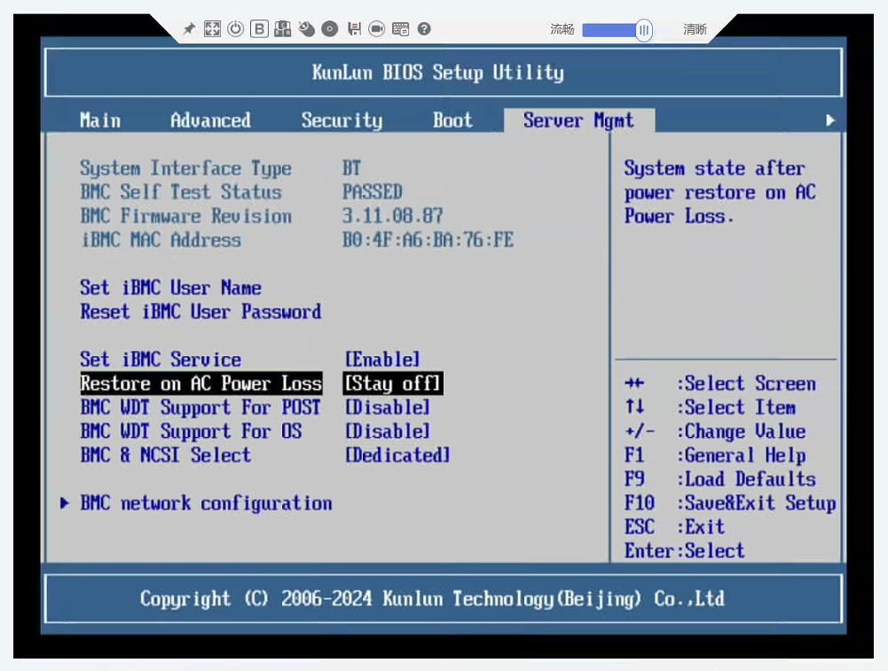 路径:Setup Utility/Go to Setup Utility>Advanced > IPMI iBMC Conf igurat ion>Restore On AC Powr Loss(Power OFF:保持下电;Last State:与上个状态相同;Power ON:保持上电)