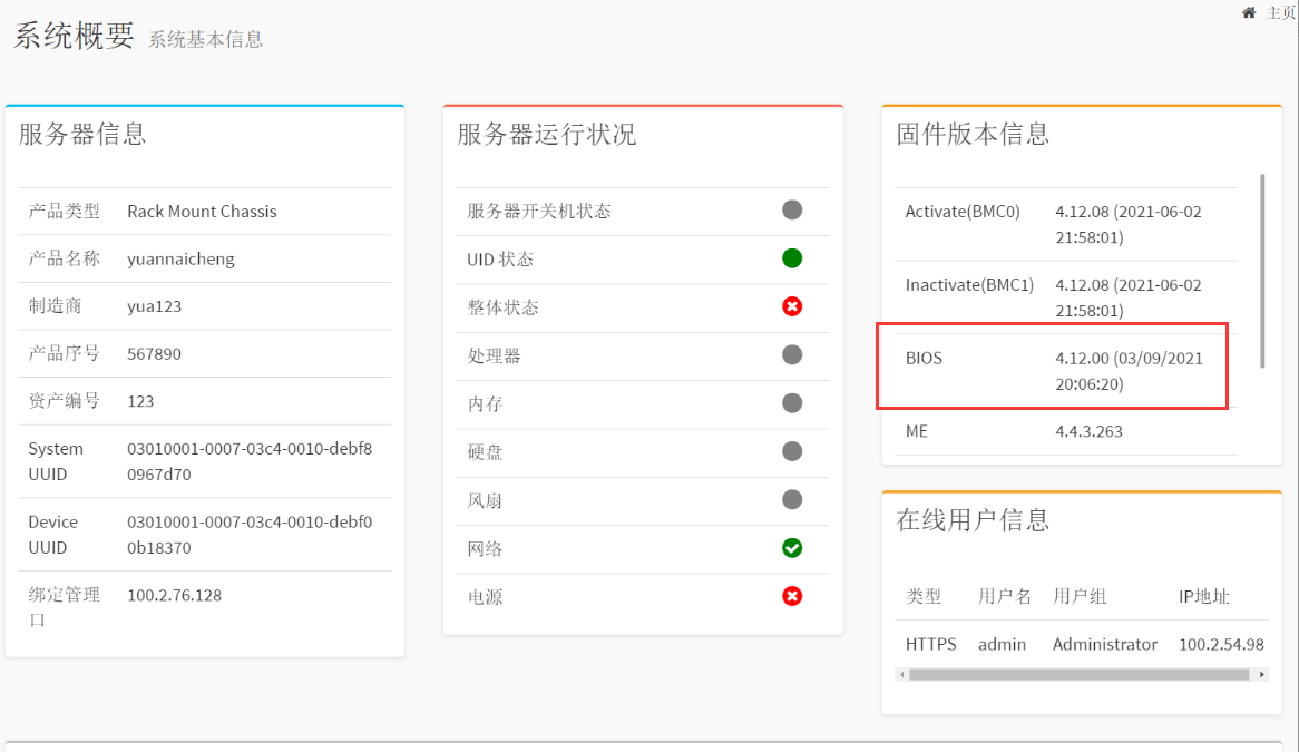 9、待操作系统重启后,重新登陆 IPMI,在右侧固件版本信息中检查 BIOS 固件版本信息