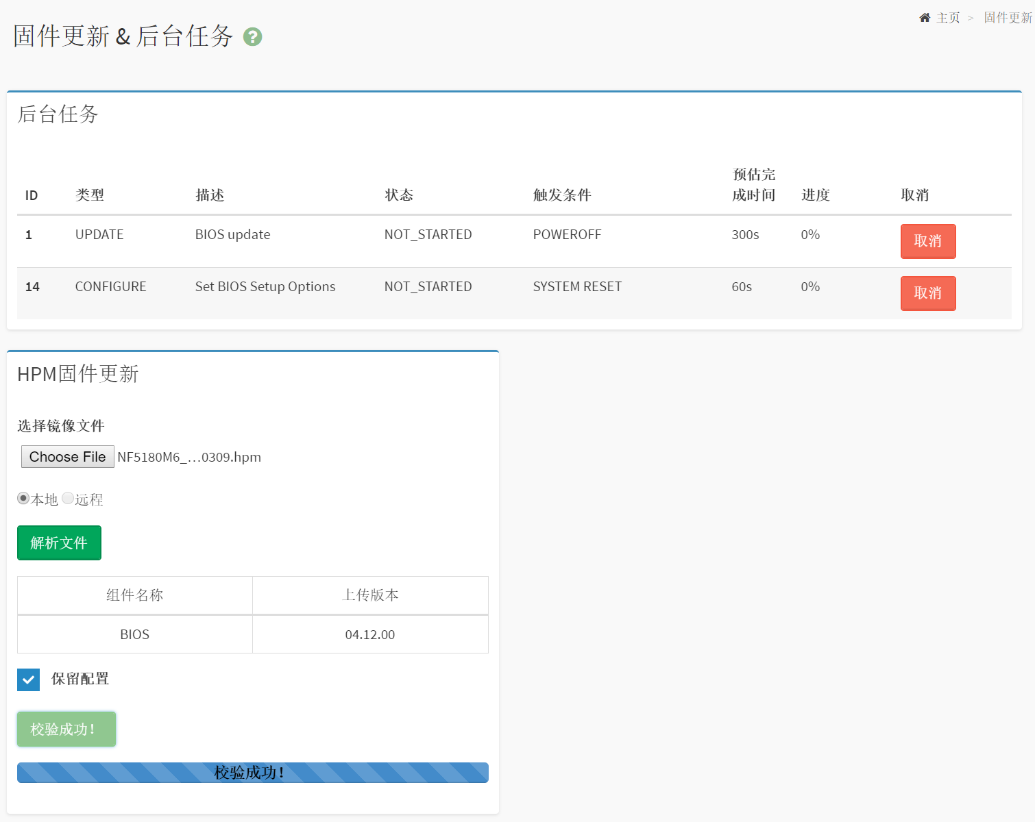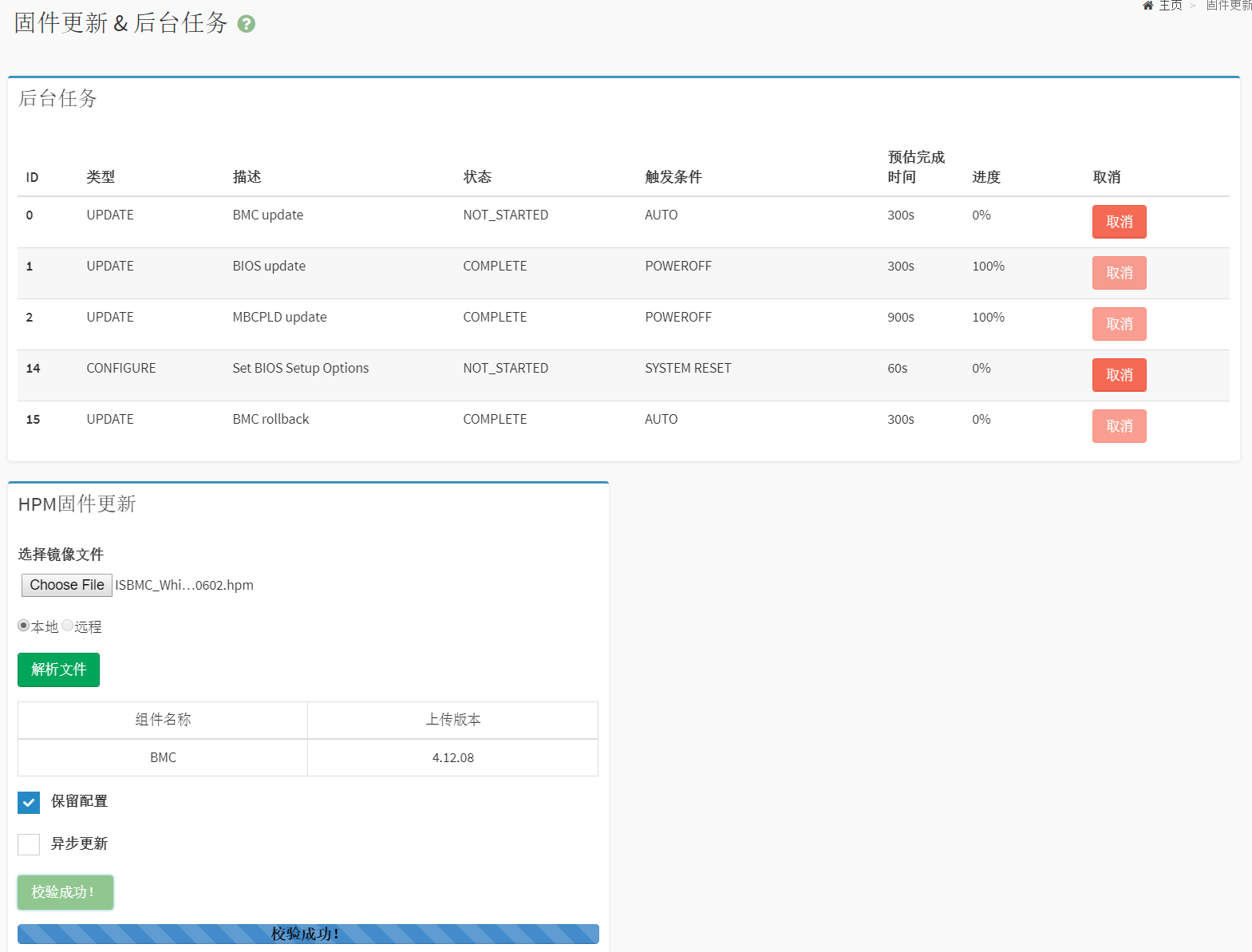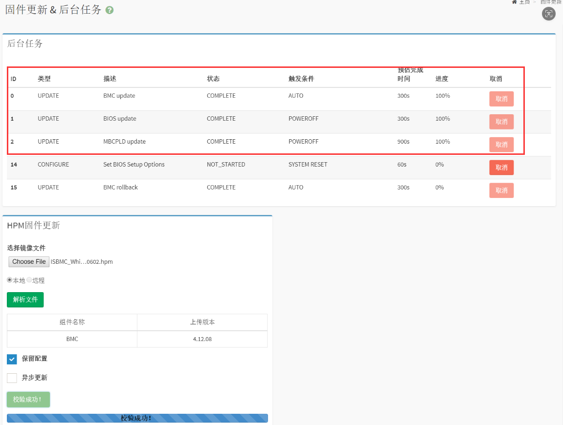 8、镜像上传成功后自动进入后台任务,进行更新,可在后台任务栏查看进度以及预估完成时间等到进度为 100%且状态变为 COMPLETE 即为刷新成功;请注意 BIOS 更新的触发条件为 power off,如果当前电源状态为 power on(OS系统要是关机状态,OS系统是指我们的系统比如超融合、桌面云系统等),则不会触发,需要 power off电源触发,可使用 ipmitool power off 命令关闭电源后,自动触发(建议升级 BIOS 前先关闭电源)