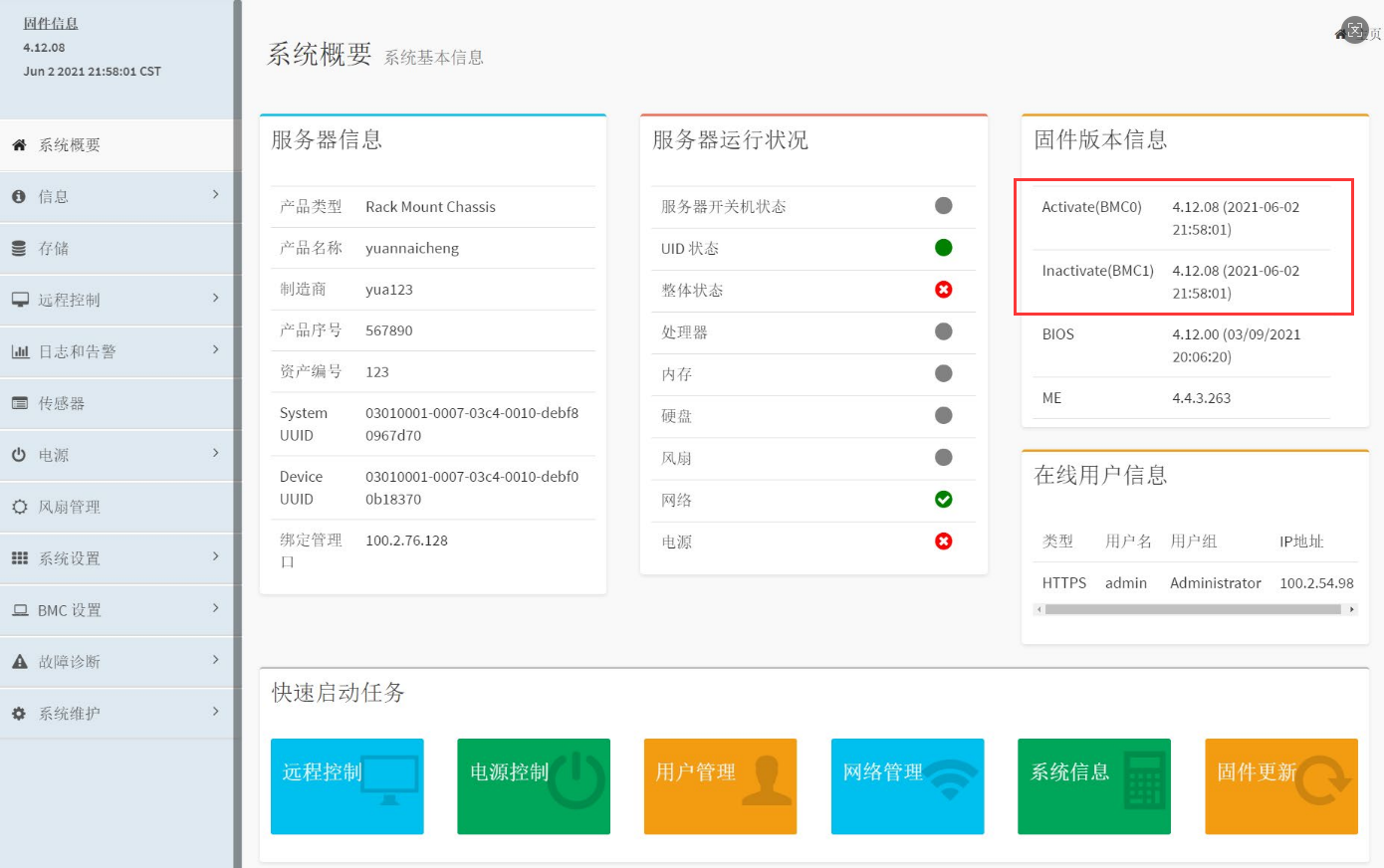 6、待到 BMC 重启后,查看 BMC 固件版本,重新登陆IPMI,检查页面左上角固件版本信息以及右侧固件版本信息中 Activate(BMC0)和 Inactivate(BMC1)的版本信息查看固件版本