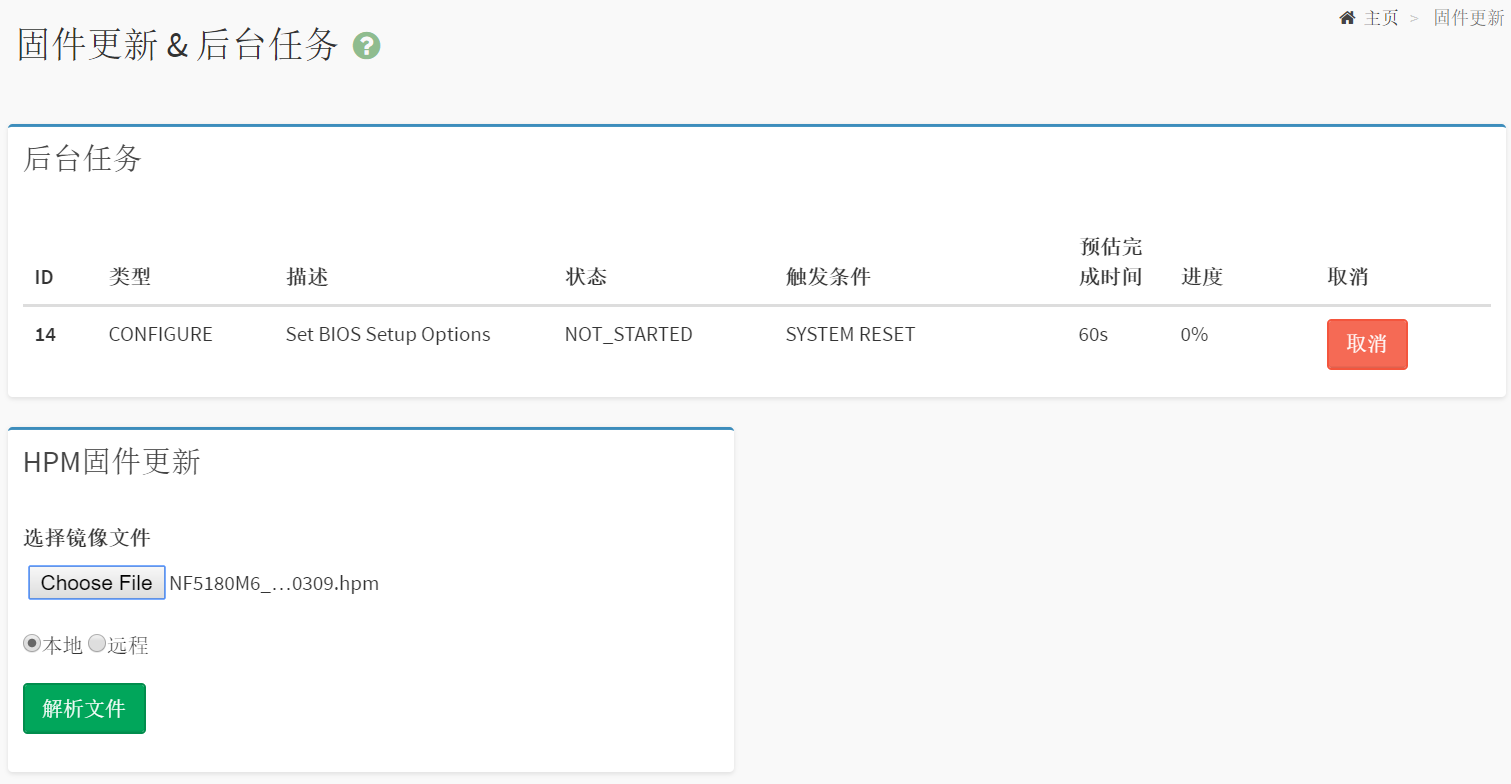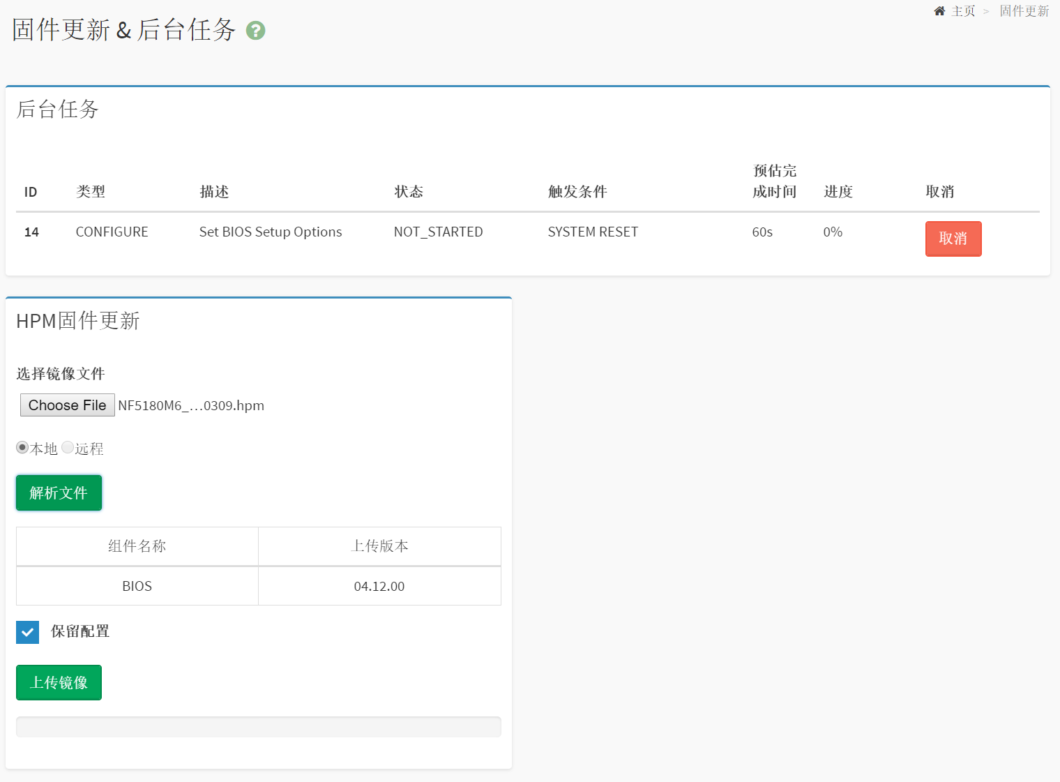 4、进入“系统维护>HPM 固件更新”页面,选择 BIOS 镜像文件