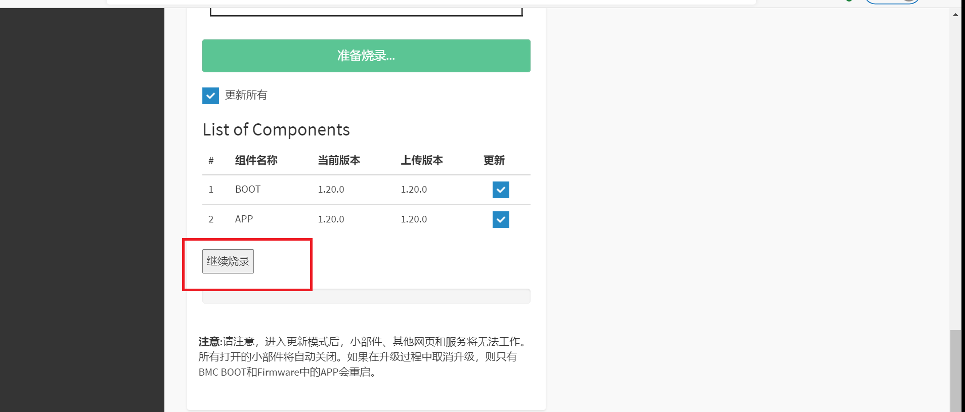 1.5、选择继续烧录进行固件更新