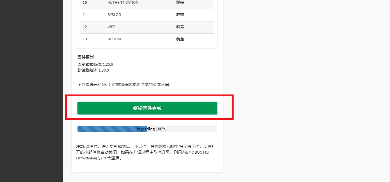 1.6、 在升级至如图所示页面后,选择“继续固件更新”继续升级直至升级结束
