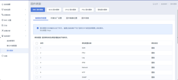 2.1、登录IPMI后依次点开系统维护-固件更新-BMC固件更新如图(刷新过程禁止断电通过Web界面刷新过程注意不勾选 “保存所有配置”选项)