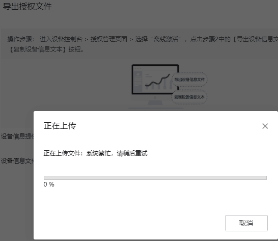 Q4:激活\更新授权时导出授权文件提示“系统繁忙,请稍后再试”