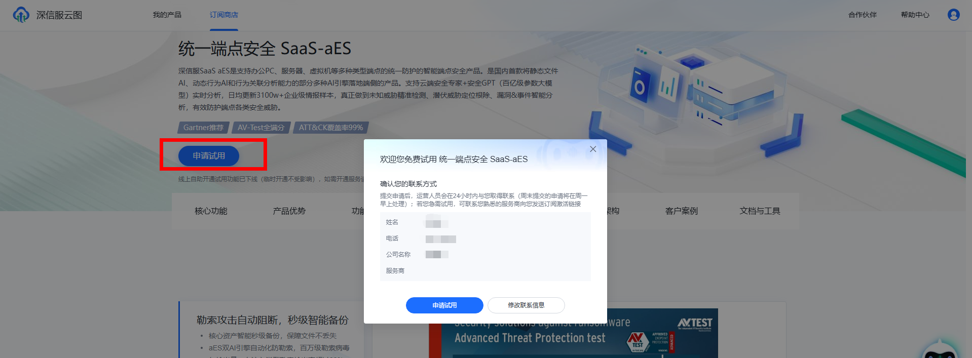 2、在深信服云图-【订阅商店】中找到统一端点安全 SaaS-aES进行申请试用