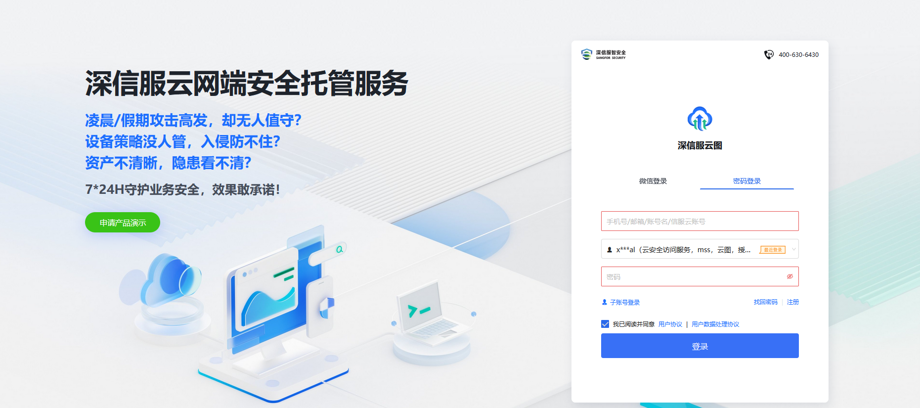1、打开浏览器,在https://x.sangfor.com.cn/,输入注册好的账号密码。(若没有账号密码,需注册后方可登录;云图、MSS、SAAS(云眼云盾等)账号可以直接登录)。