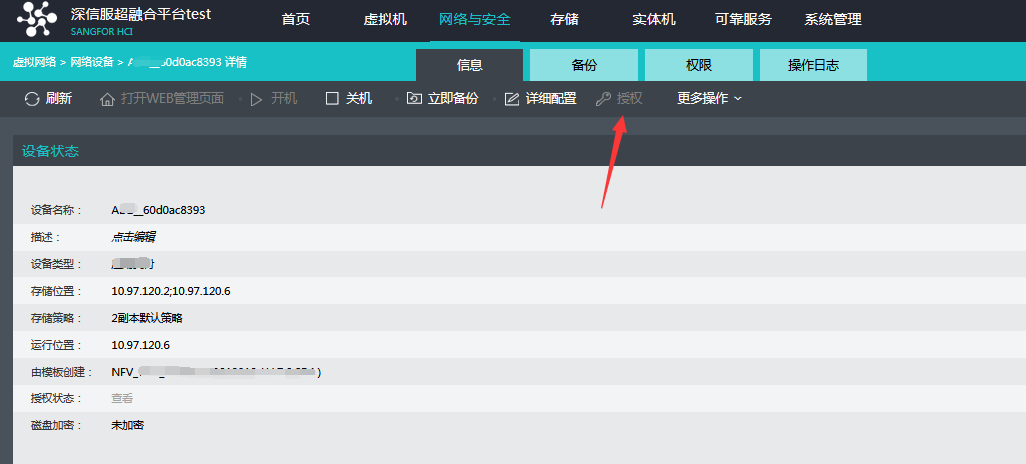 - 方法一:SCP控制台进入【管理】或者【系统管理】-【授权管理】-【安全资源池授权】,对应虚拟网络设备关机以后,选择对应的设备进行授权