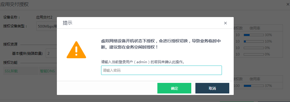 - 2、当需要修改vAF虚拟设备的带宽吞吐量的情况下或者是线路带宽的时候(非第一次更新,假如带宽由1GB改为3GB),设备会针对授权类型和硬件配置进行检测,提示如下图: