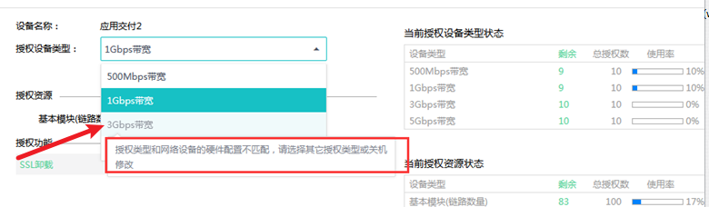 - 不支持直接修改的场景下,会提示:检测到授权类型和网络设备的硬件配置不匹配,需要关机后操作.