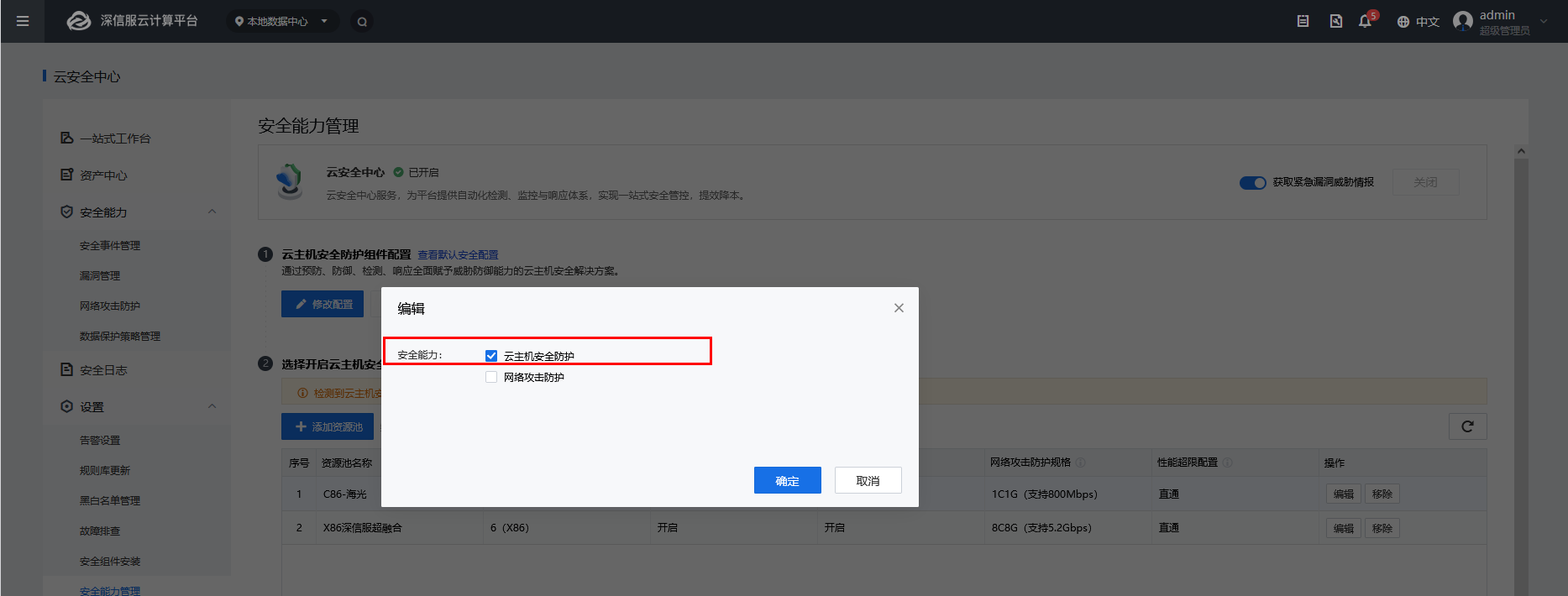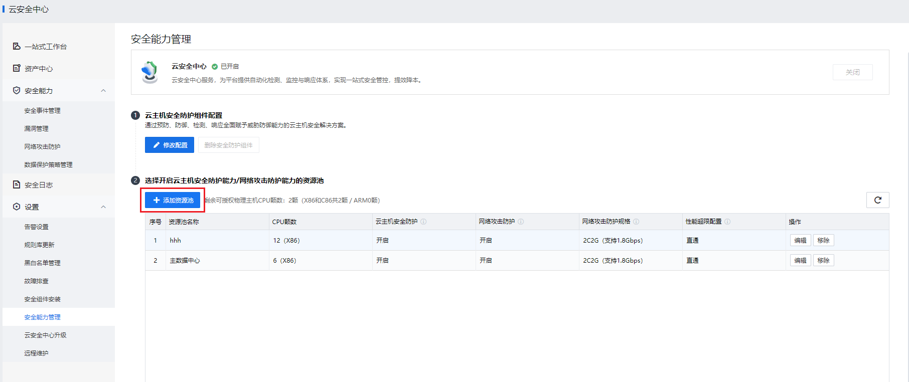 8、部署成功后继续回到[安全能力管理]页面,点击<添加资源池>,为资源池开启云主机安全防护