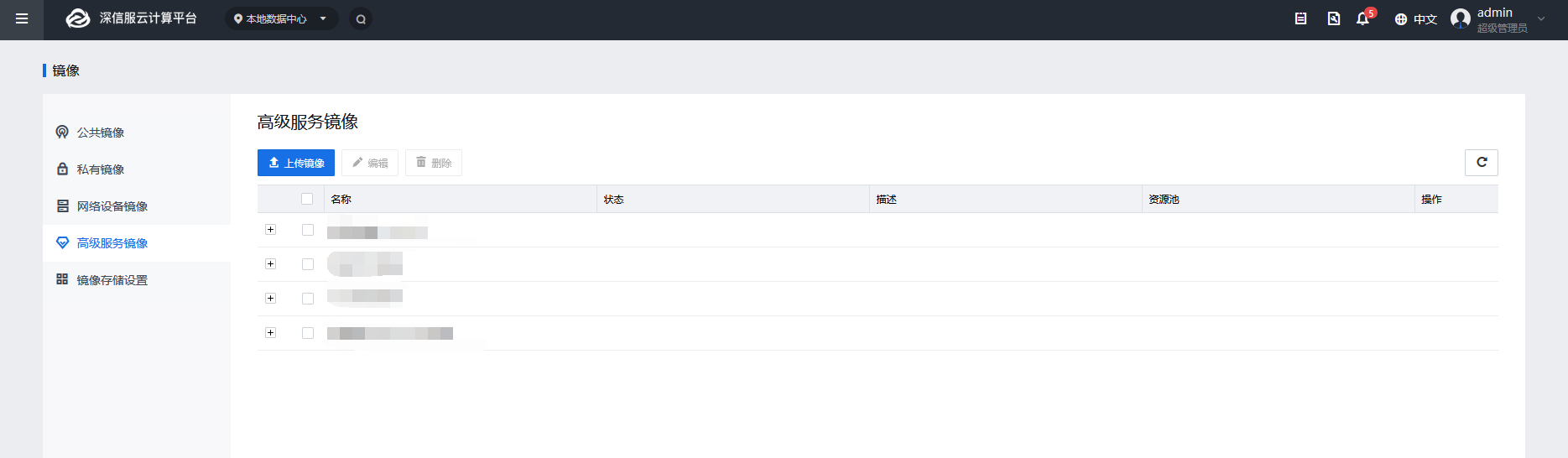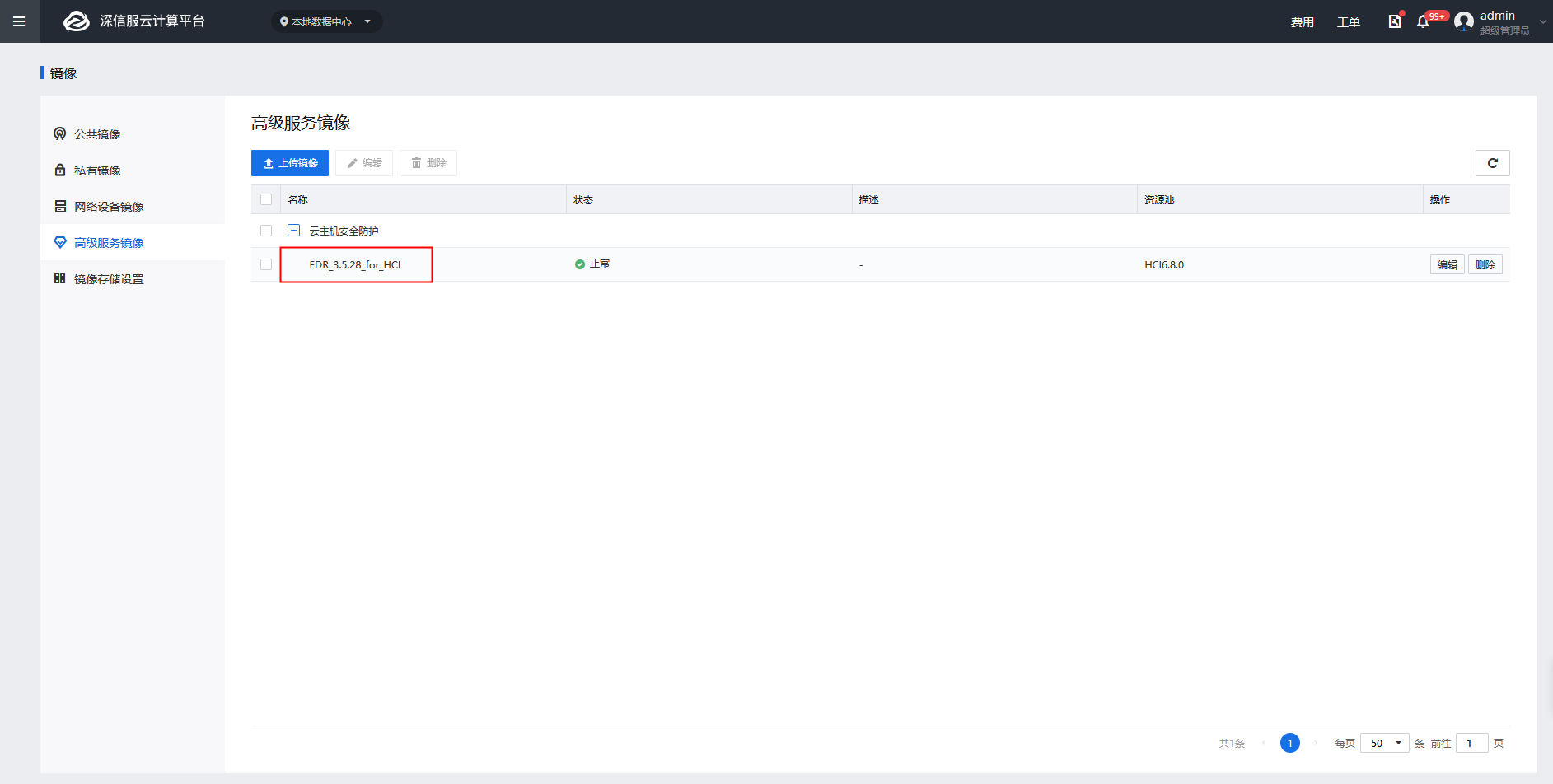 1、登录SCP控制台【计算】-【镜像】-【高级服务镜像】,点击<上传镜像>按钮(镜像文件可以从深信服社区下载)