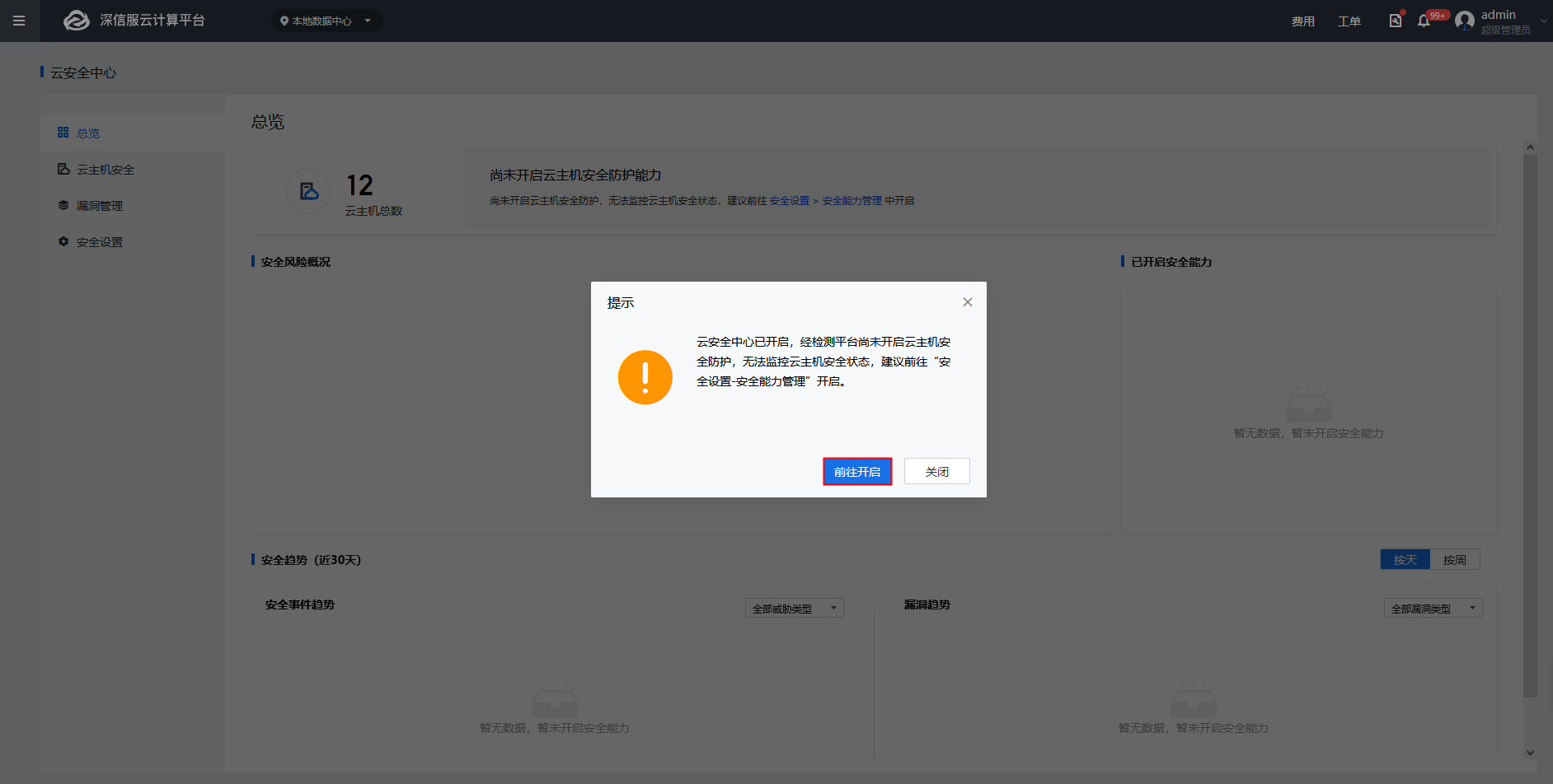 4、完成aSEC安装后,进入[云安全中心]页面,在弹出的提示页面点击<前往开启>,开启云主机安全防护。