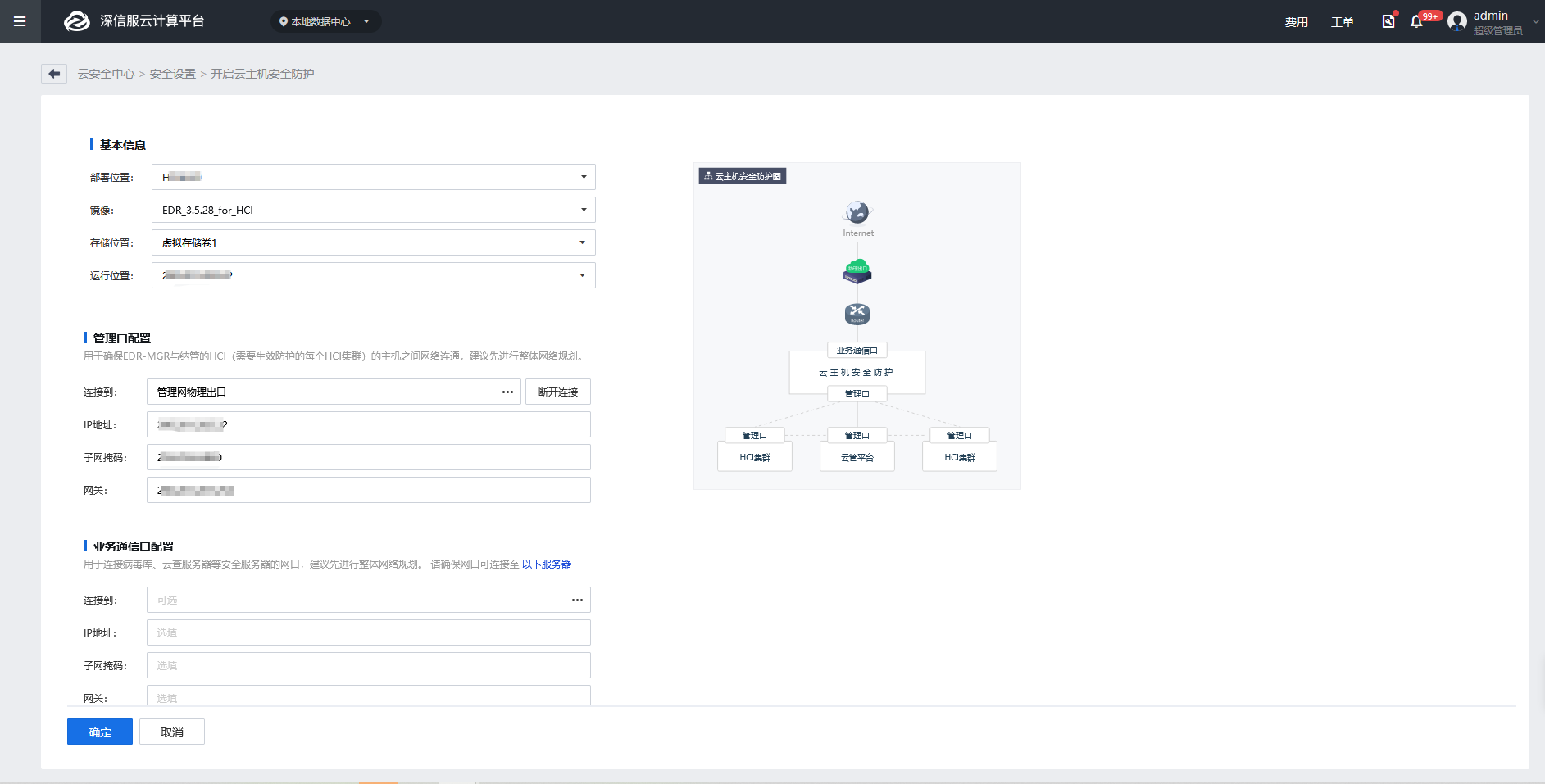 • 业务通信口配置(可选):连接到业务网物理出口,用于连接病毒库、云查服务等安全服务器,需保证其可以正常联网即可