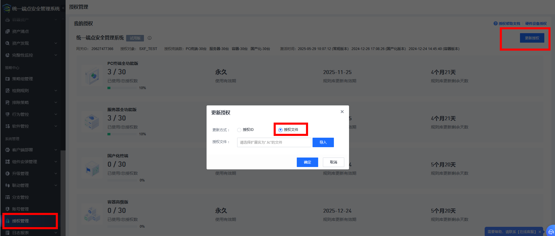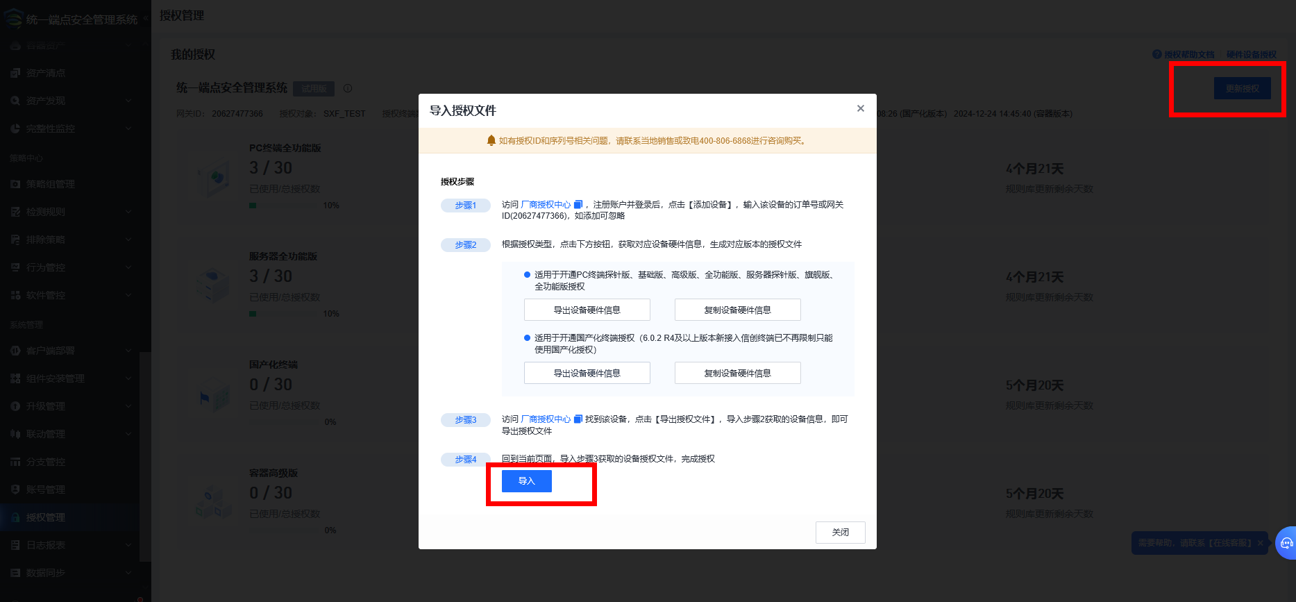 4、登陆需要更新的EDR/aES平台,在【系统管理】-【授权管理】中点击更新授权,然后“导入设备授权文件”即可