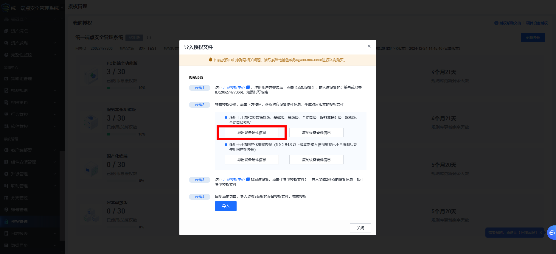 2、登陆需要更新的EDR/aES平台,在【系统管理】-【授权管理】中点击更新授权,切换为硬件设备授权后,导出非国产化硬件信息