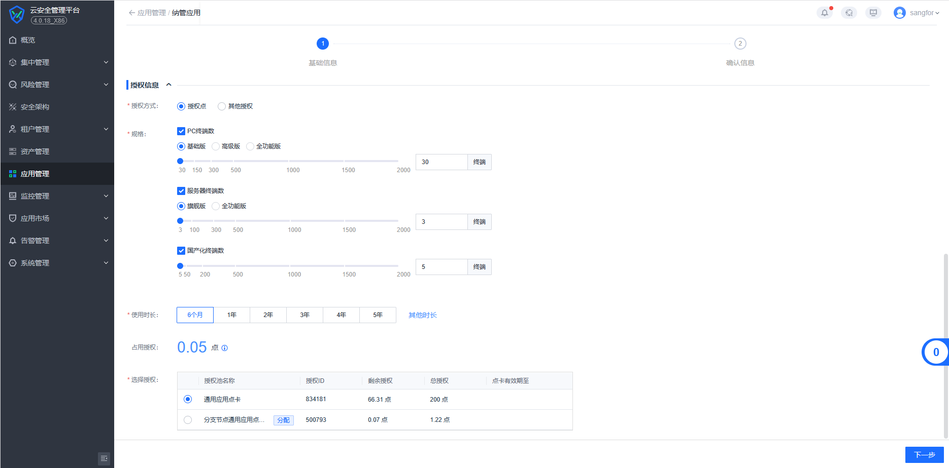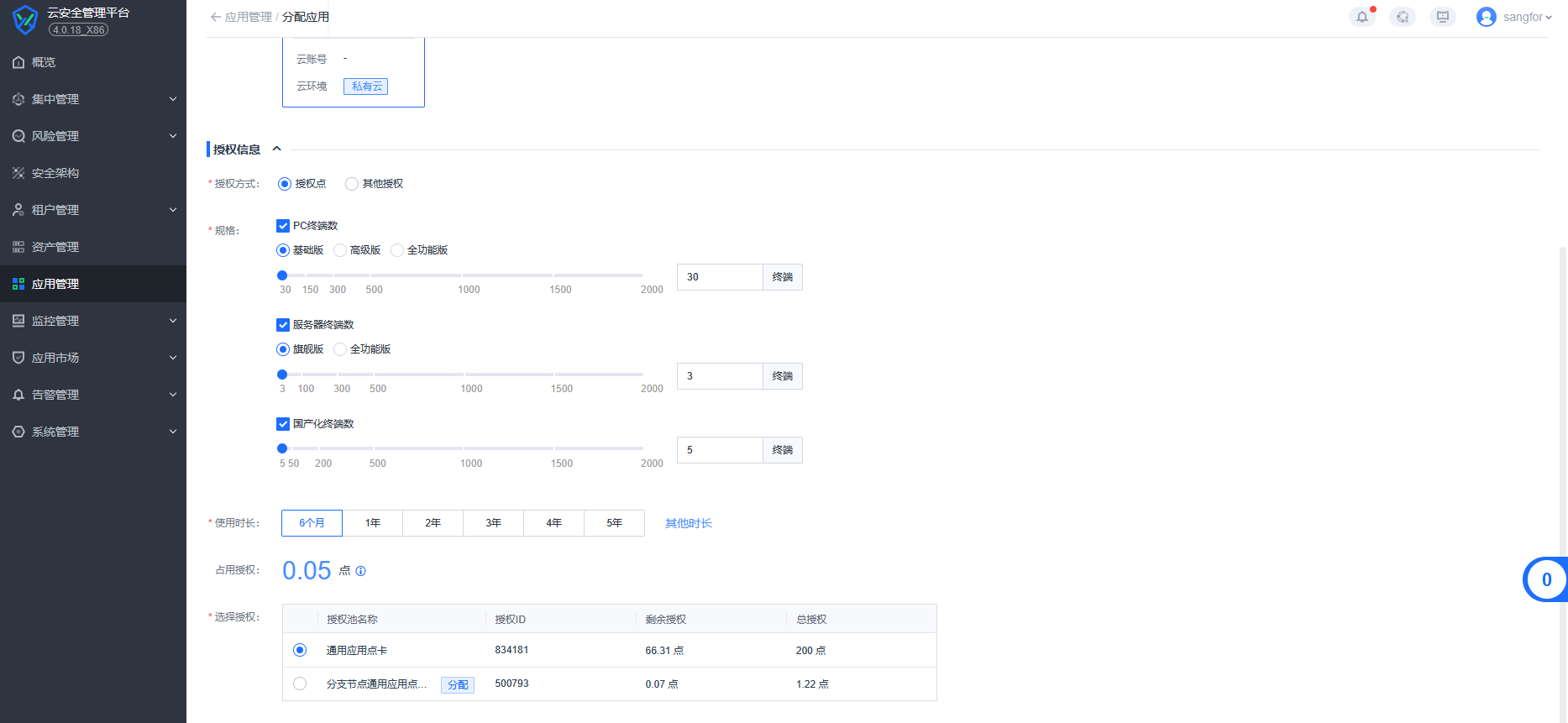 2、在【应用管理】-【新增应用】-【分配应用/纳管应用】选择统一端点安全管理系统并分配授权信息(部署授权一体)