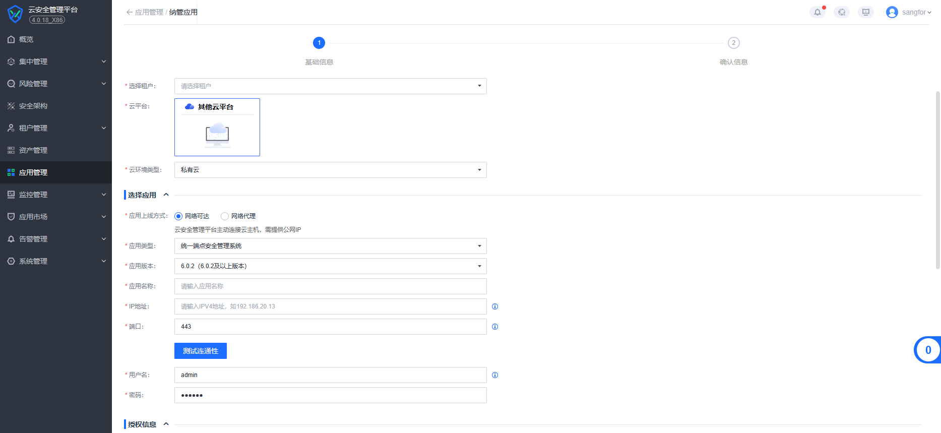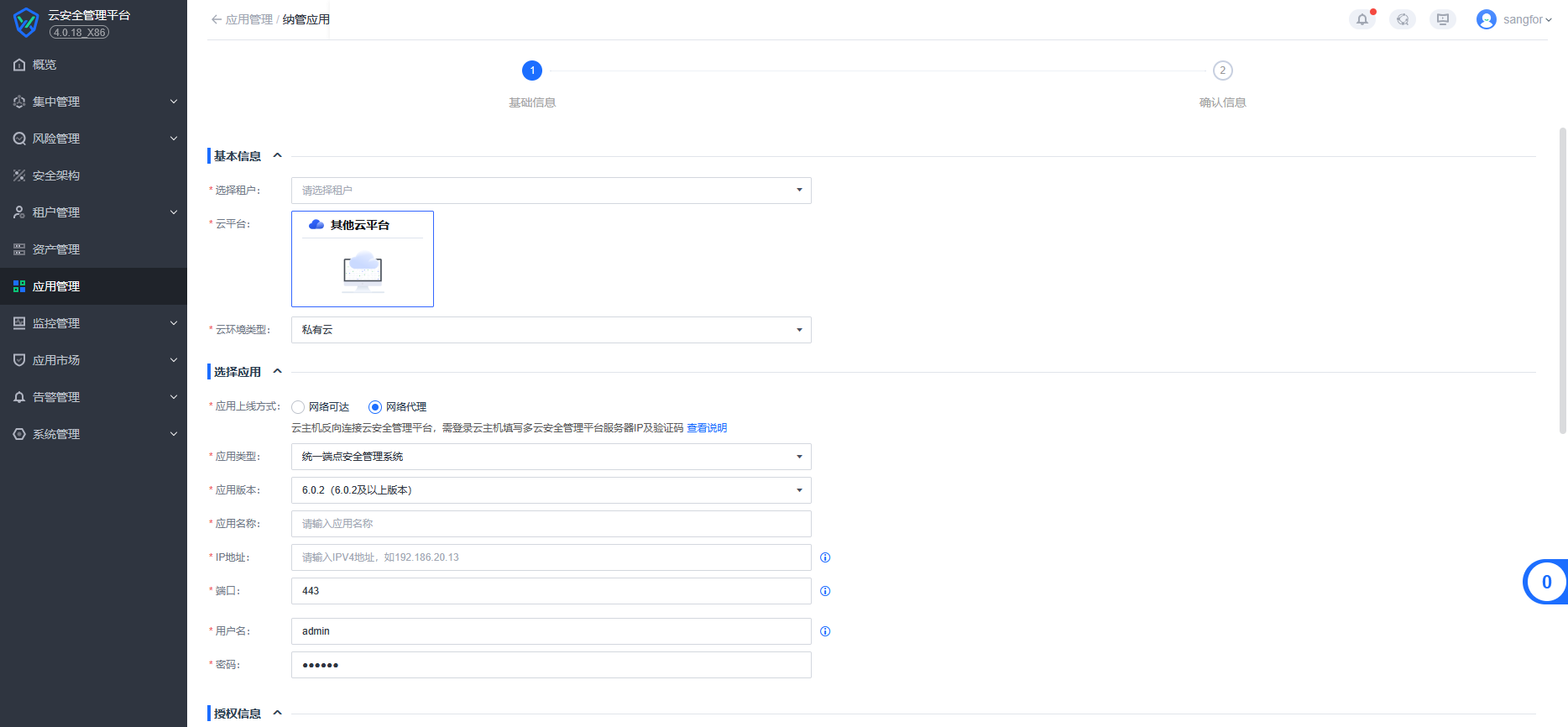 【纳管应用】:适用于需要将安全组件部署在客户其他云环境内部进行安全防护的场景,此时分为两种:已适配的云环境和未适配的云环境(其他云),授权方式也分为网络可达和网络代理两种