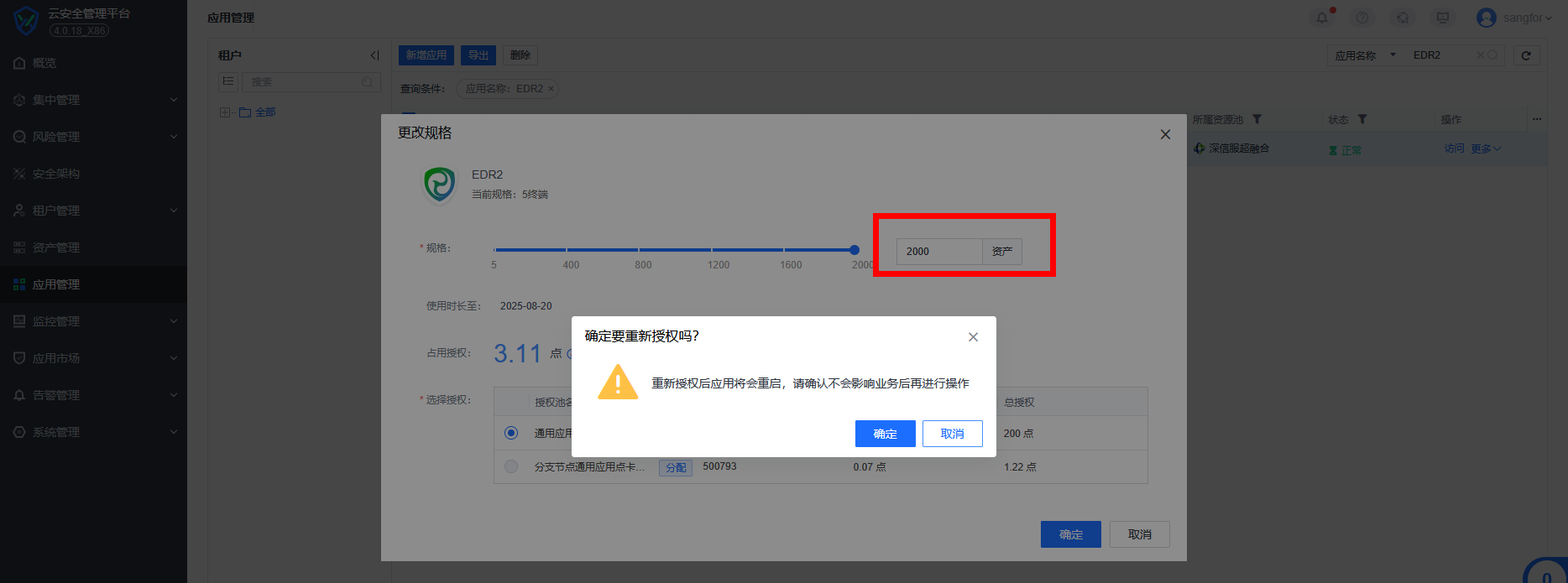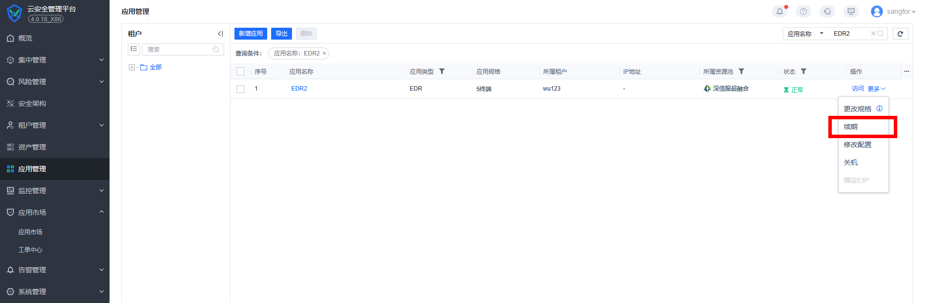 2、在【应用管理】中选择指定租户或区域的EDR或统一端点安全管理系统进行加点或续期