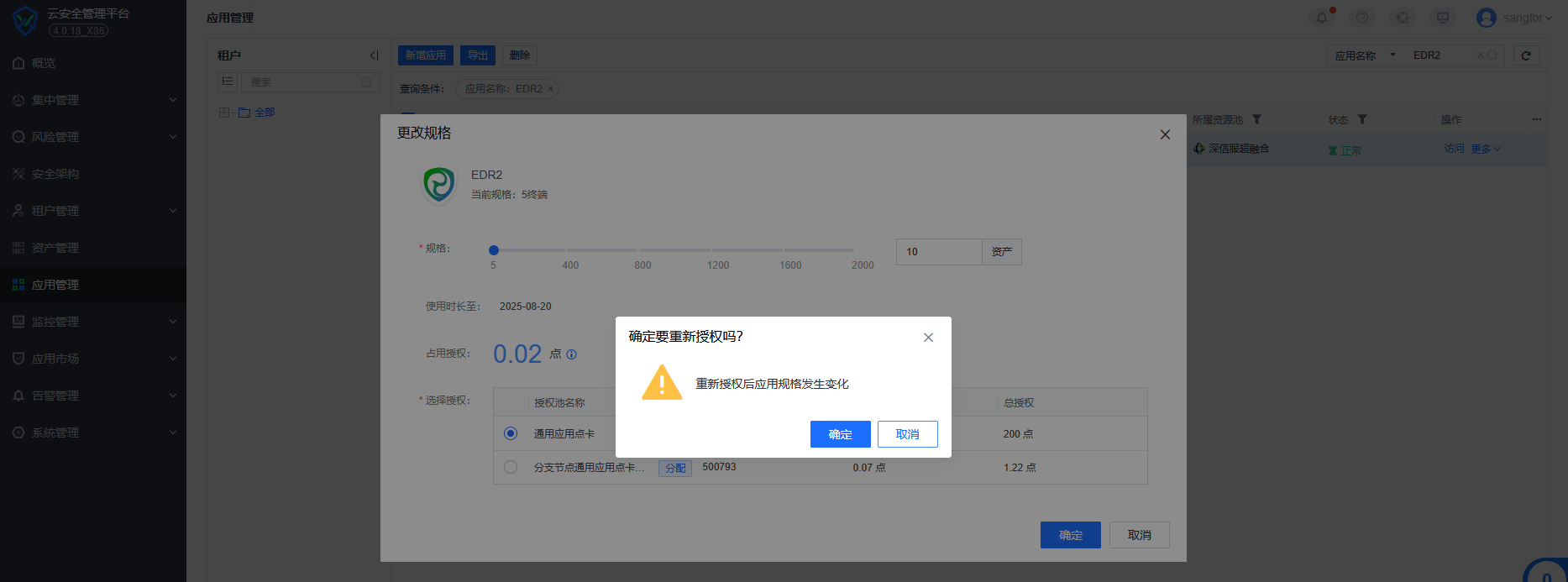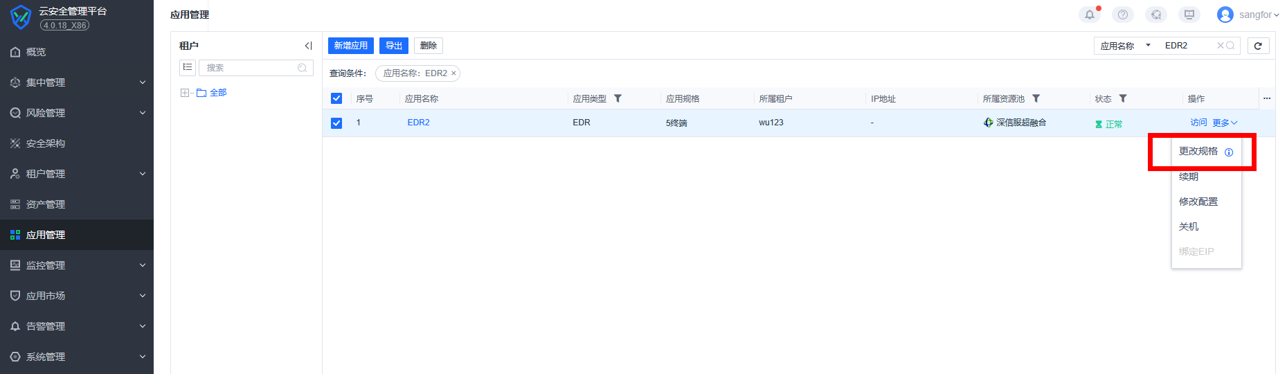 可在【应用管理】中选择指定租户或区域的EDR或统一端点安全管理系统后,点击【更多】-选择【更改规格】