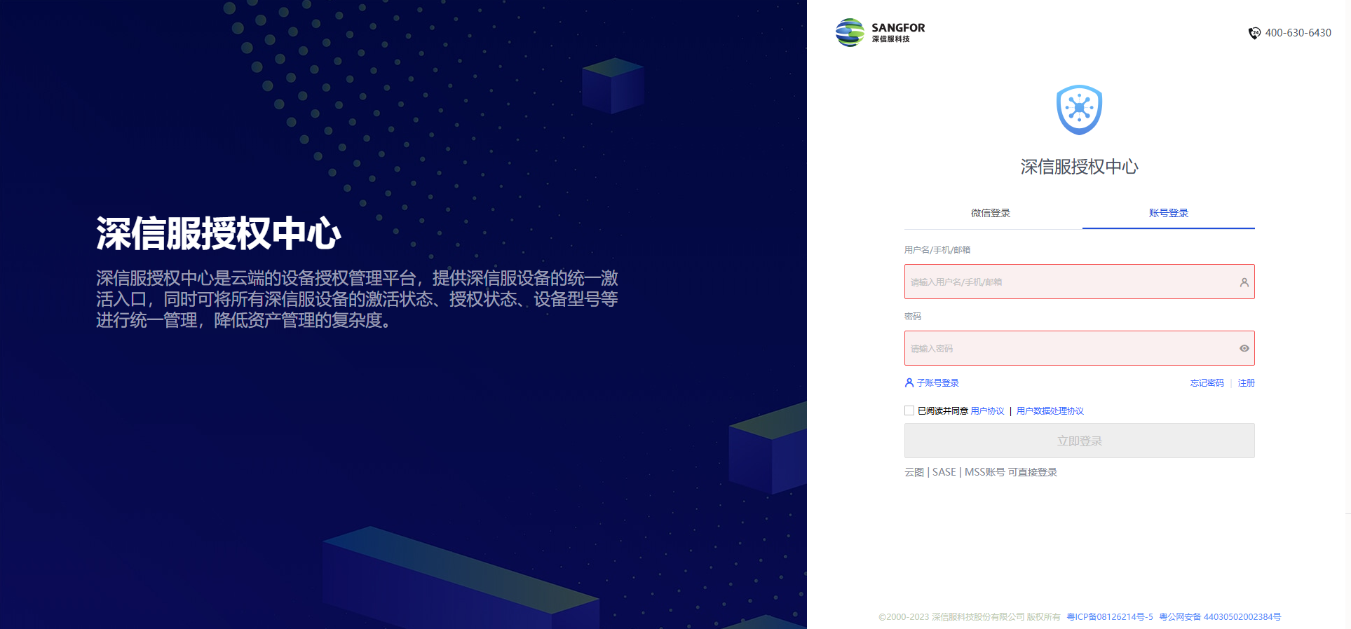 1、打开浏览器,输入深信服授权中心地址:https://license.sangfor.com.cn, 输入注册好的账号密码。(若没有账号密码,需注册后方可登录;云图、MSS、SAAS(云眼云盾等)账号可以直接登录)。