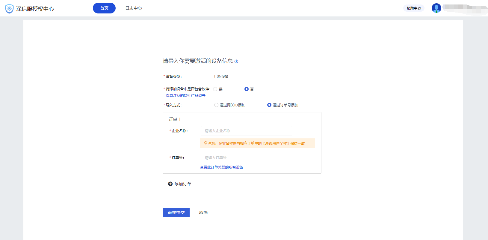 3、导入需要激活的设备,可以通过订单号批量添加或通过网关ID添加。(企业名称需与订单系统的名称保持一致)。