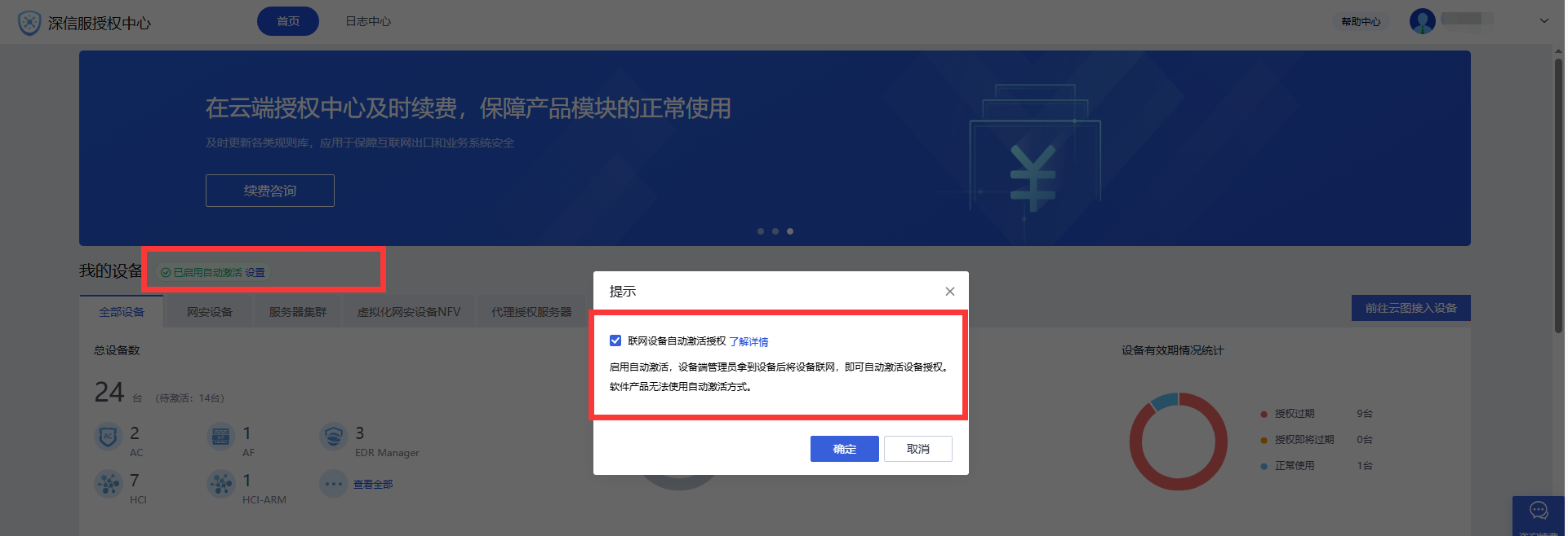 5、若需AF设备“在线激活”,必须在授权中心“启用自动激活设置”,且让AF设备联网