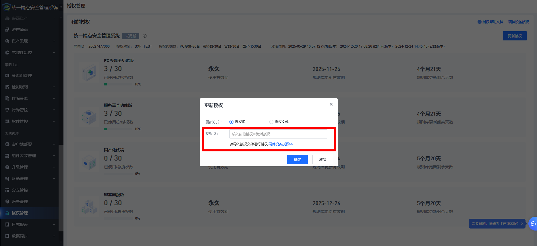6、登陆需要激活的EDR/aES平台,在【系统管理】-【授权管理】中点击更新授权,输入授权ID进行激活时会提示在线授权失败,此时可以前往离线授权