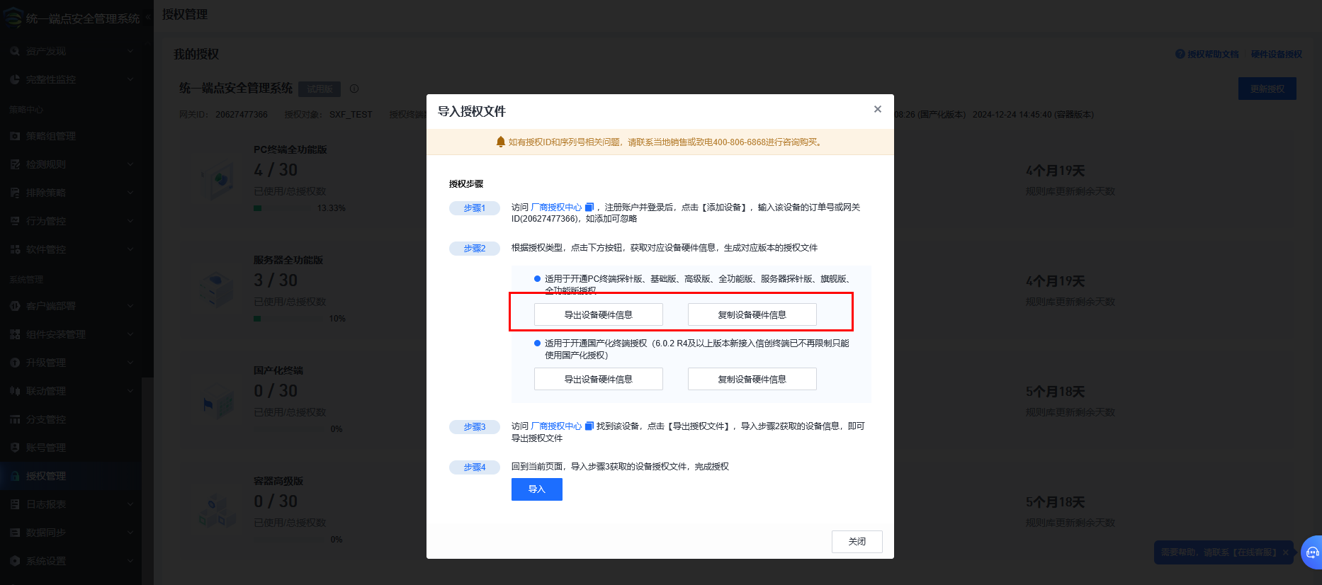 ①切换为硬件设备授权,导出非国产化设备硬件信息