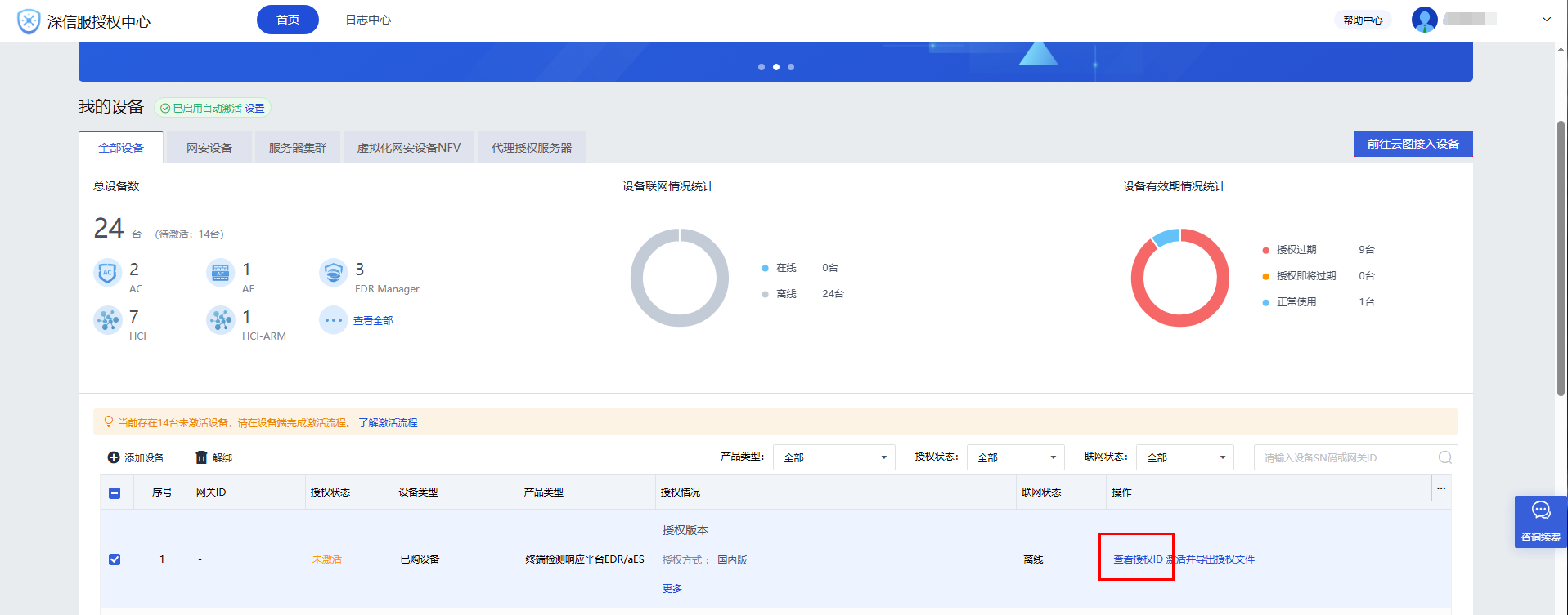 5、找到需要激活的EDR/aES设备,点击[查看授权ID]即可获取产品授权ID