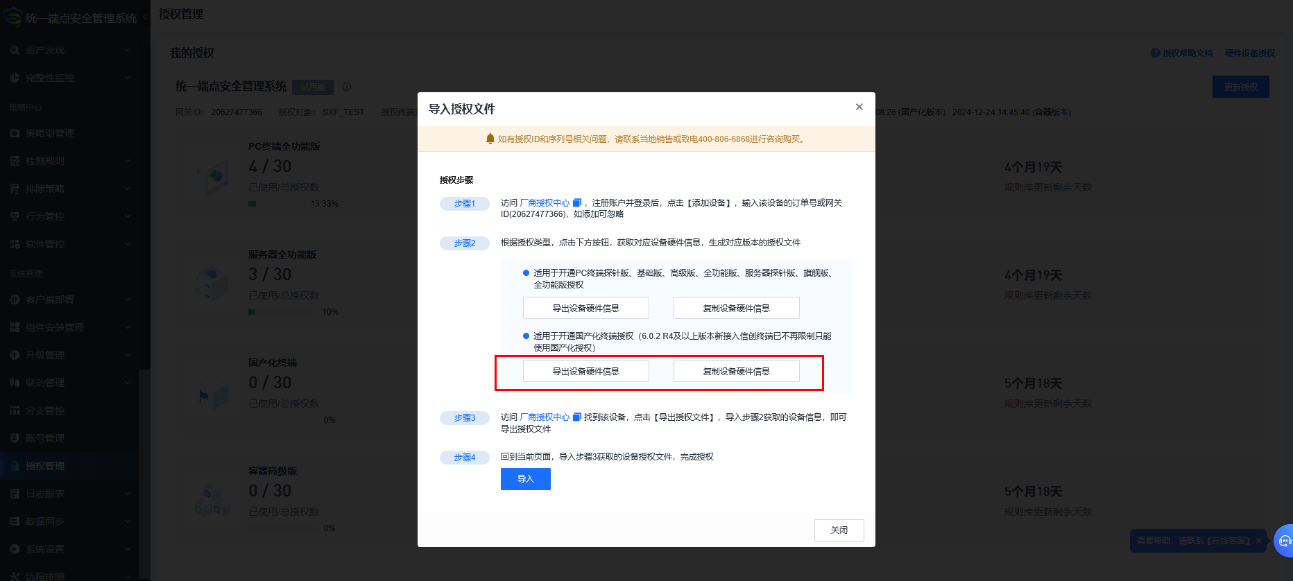 5、登陆需要激活的EDR/aES平台,在【系统管理】-【授权管理】中点击更新授权,切换为硬件设备授权,导出国产化设备硬件信息