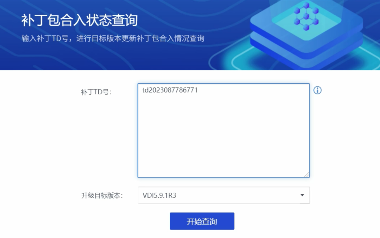 2、输入想要查询的版本,以及对应的补丁TD号,点击开始查询,即可查询出补丁是否已经在该版本合入。