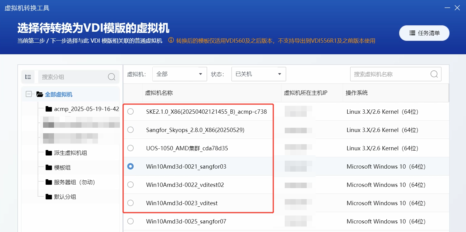 3、选择需要将哪个友商迁移过来的虚拟机,转换成VDI虚拟机模板(通常是把友商原有的虚拟机模板,转换成深信服的VDI模板):